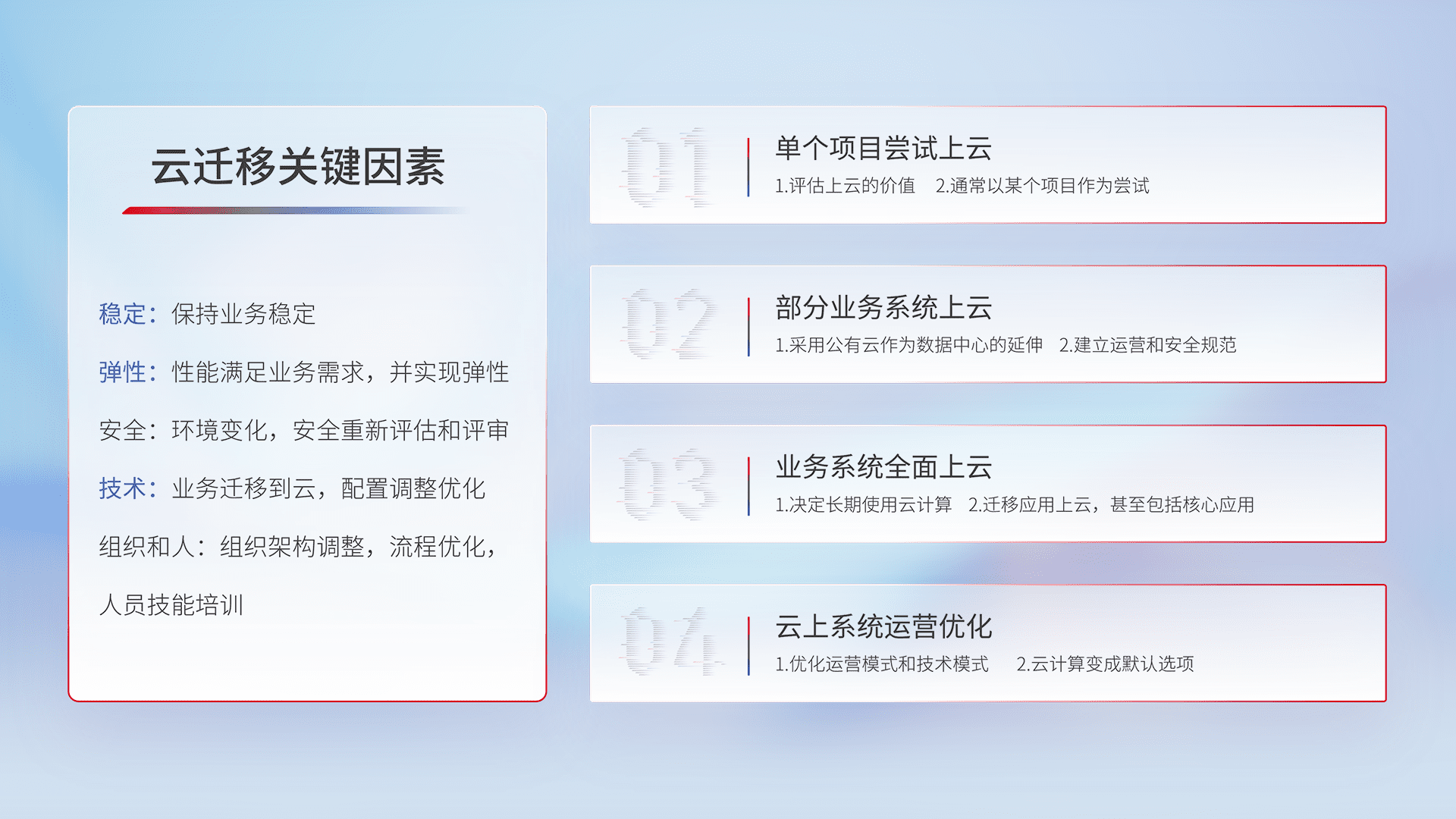 结合实际业务,,从规划设计、、、、云平台选型、、云原生改造、、、、数据迁移、、、、集成交付,,迁移全过程为客户识别最佳上云路径,,,做好风险识别管理,,,,设计网络架构、、、、身份权限、、、安全审计合规、、、操作审计、、、、日志审计、、、监控告警策略、、、、多站点容灾设计等,,,对云上基础设施进行整体规划,,,,提升IT治理水平,,,,以满足弹性、、、高可用、、、高性能的需求。。。