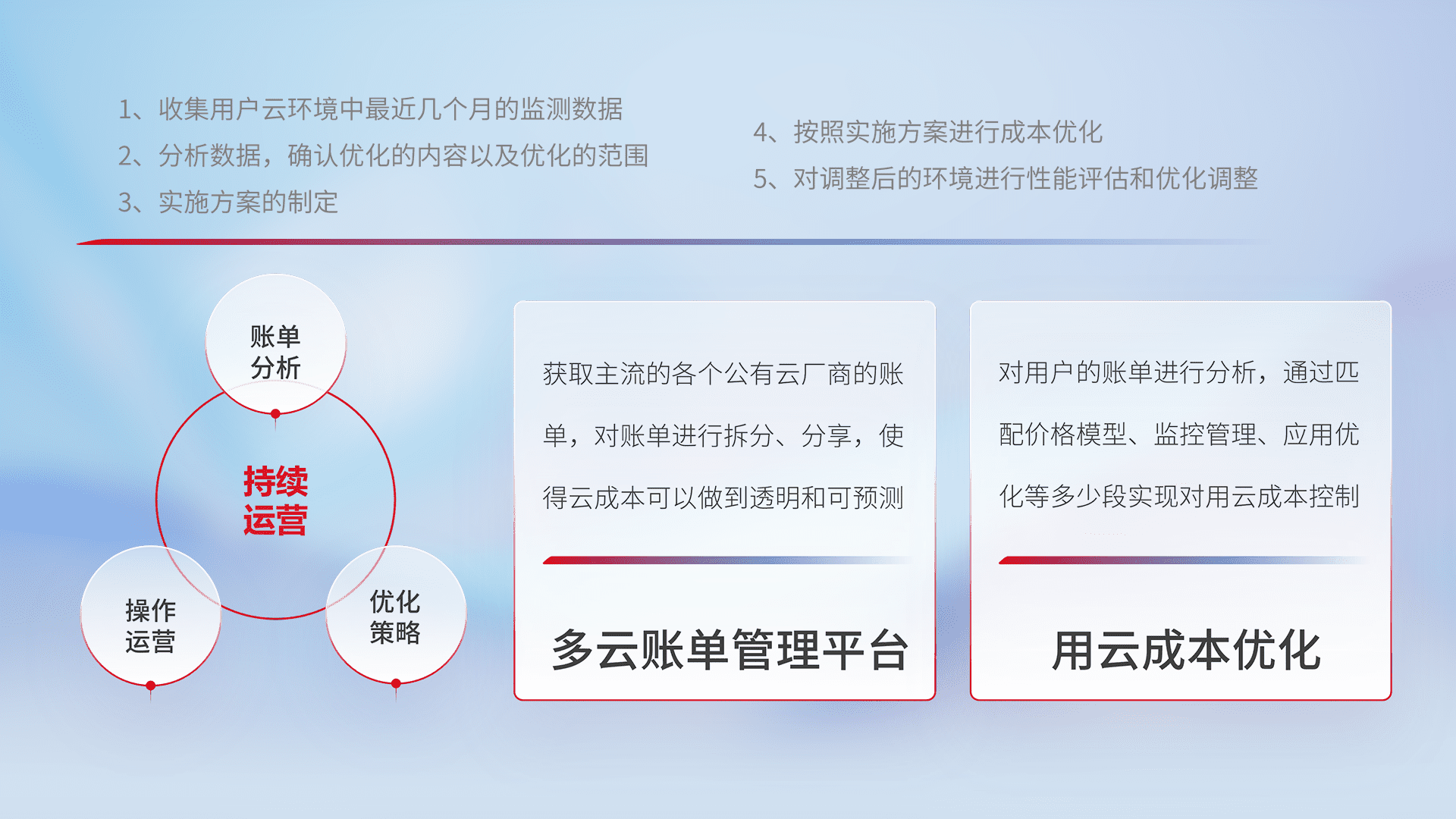 通过多云纳管,,以统一的资源数据模型把客户的云资源进行抽象和封装,,进而实现对多云资源的统一操作,,,,保障云资源管理的可靠性、、稳定性与可用性。。。量身定制化运维内容,,,,配置、、开发运维、、、、补丁管理、、、备份、、、监控、、认证和访问管理、、、、审计和日常巡检等,,保障在用云过程中的可靠度,,,稳定度以及高可用率。。。。