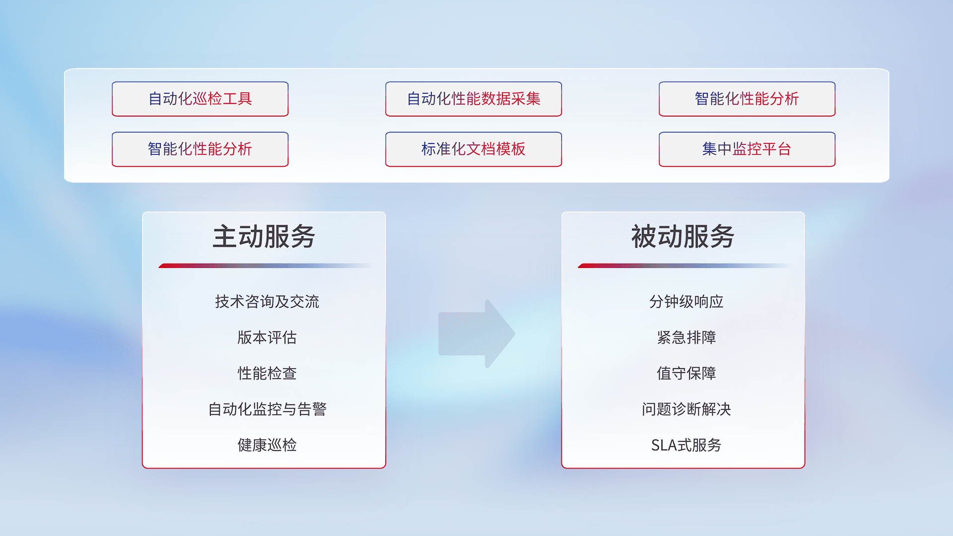 智能化工具和标准化文档,,,,保障服务质量,,提供主动服务(包含技术咨询、、版本评估、、性能检查、、、自动化监控与告警、、健康巡检)和被动服务包含(分钟级响应、、紧急排障、、、、值守保障、、、、问题诊断解决、、SLA服务)。。。。